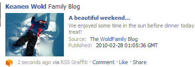 Tonight I was searching Google for another method to do this and thankfully there is an application out there called RSS Graffiti. This application allows me to add multiple blogs. I can even add to the title to designate what the source is. The application offers many options for presenting a users blog posts in Facebook and even a preview like the one below.